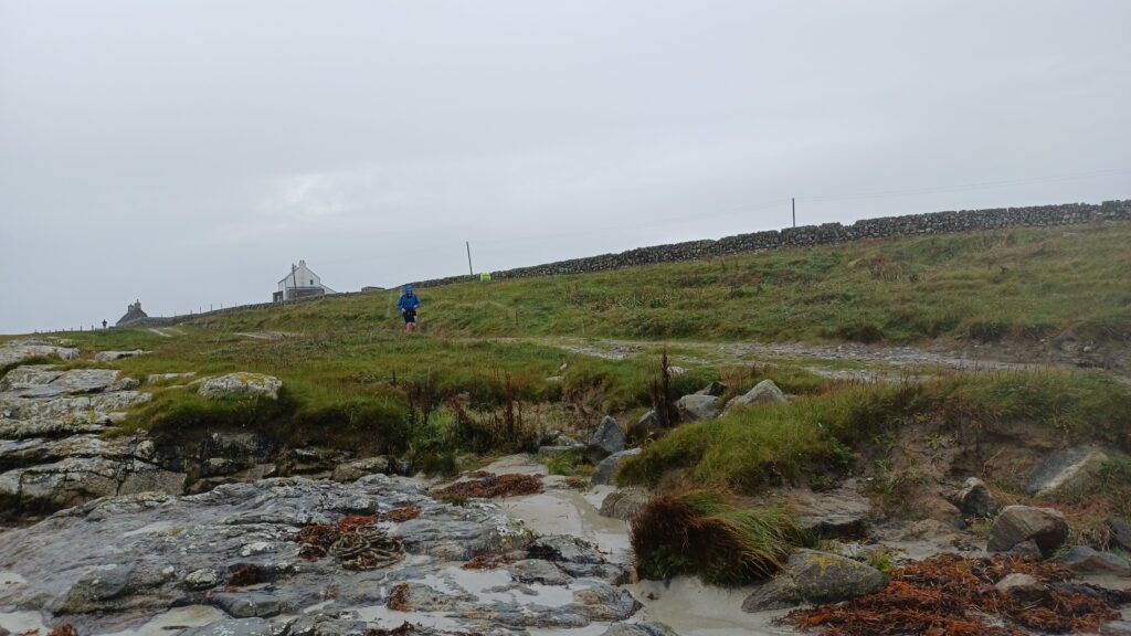 I usually do a mix of running and walking, but this year I pretty much ran every mile with the exceptions of the clambery bits where you pick your way through bog or over slippery stones … and a section on the west of the island. With wind full in our faces, I realised that my goal of running continuously was a little foolish as the woman a hundred years ahead walked faster than I was running. I realised it was futile when I quite literally found myself running in the spot – with each step the forward speed was immediately canclled by the wind blowing me back.
