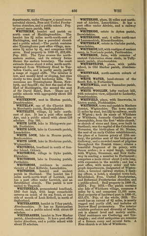 WHITHORN, town and parish in Machers district, Wigtonshire. The town stands 11 miles by road, but 12 by railway, south of Wigton ; took its name of Whithorn or Whithern, formerly Candida-Casa or Leucophibia, from the first ' white church,' or church of stone and lime, ever built in Scotland ; was the capital of the Caledonian Novantes, the birth-place of St. Ninian, the seat of an early Culdee establishment, the place of a famous priory of 12th century, the pristine seat of the bishopric of Galloway, and a crowded resort of pilgrims throughout the Romish times ; retains a beautiful fragment of its priory, with Saxon arches ; is a royal burgh, uniting with Wigton, Stranraer, and New Galloway in sending a member to Parliament ; comprises a main street about f mile long, with expansion in the middle ; and has a post office, with money order and telegraph departments, designated of Wigtonshire, a terminal railway station, 2 banking offices, a hotel, a steepled town-hall, Established, Free, United Presbyterian, and Reformed. Presbyterian churches, and a public school. Real property in 1880-81, 3374. Pop. 1653. The parish contains also Isle of Whithorn village, measures 8 miles by 4, and comprises 11,891 acres. Real property of landward part in 1880-81, 15,478. Pop. of the whole, 2929. The coast has an extent of 6f miles, is mostly rugged and partly cliff, and includes all Burrow Head promontory. The interior exhibits profusion and diversity of knolls, yet is almost level and mainly arable. Chief residences are Castlerigg and Tonderghie ; and chief antiquities are remains of a Roman camp and several forts. A Free church is at Isle of Whithorn.